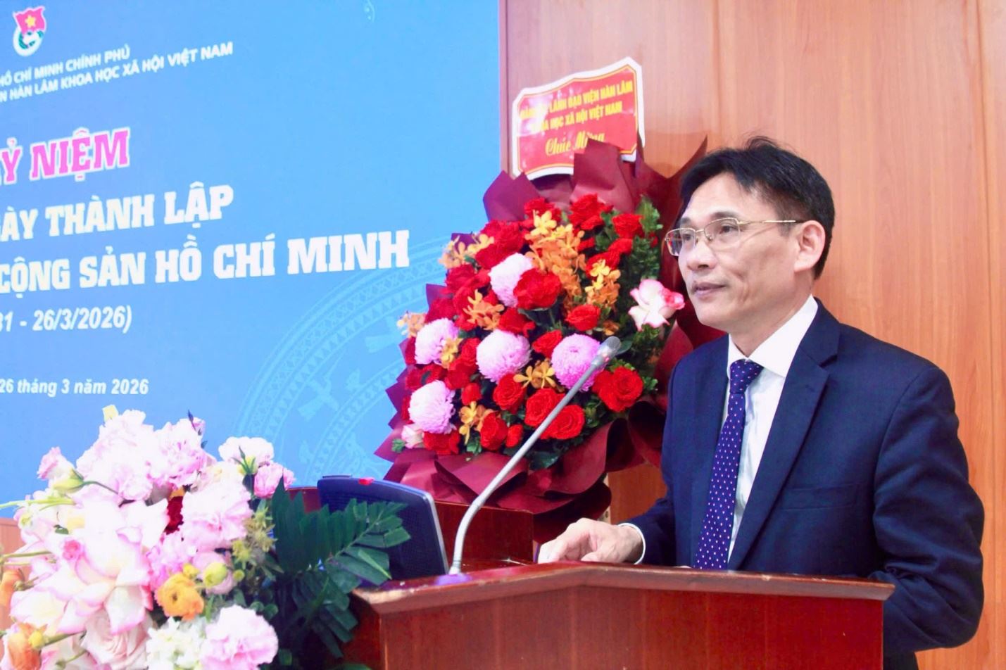 TS. Trần Đình Hưng, Bí thư Đoàn Thanh niên Viện Hàn lâm Khoa học xã hội Việt Nam trình bày diễn văn kỷ niệm 95 năm Ngày thành lập Đoàn